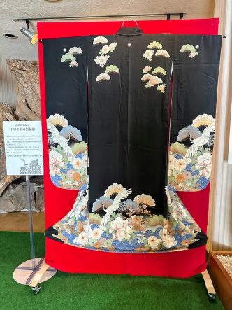 令和8(2026)の本館受付前「収蔵資料展示」は、お雛様や五月人形の展示以外に、服飾品を中心に展示します。 1月は町内の呉服店にあった正絹の五つ紋入りの黒振袖です。大正末から昭和初期の品とされ、松・梅・菊・牡丹・花菱七宝 …
