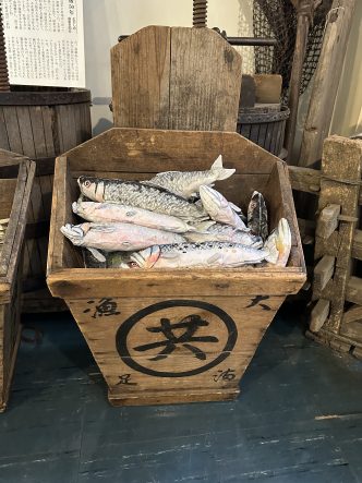「漁業の歴史」展示コーナーのもっこに手作りの鰊を入れました 知床博物館「漁業の歴史」展示コーナーでは、「もっこ」に手作りの鰊をいれました。 鰊は実物に近い、長さ約40センチ、重さ250gにしました。布に彩色をして、中に石や梱包材を詰めて作りました。鮮やかに光る鱗を表 …