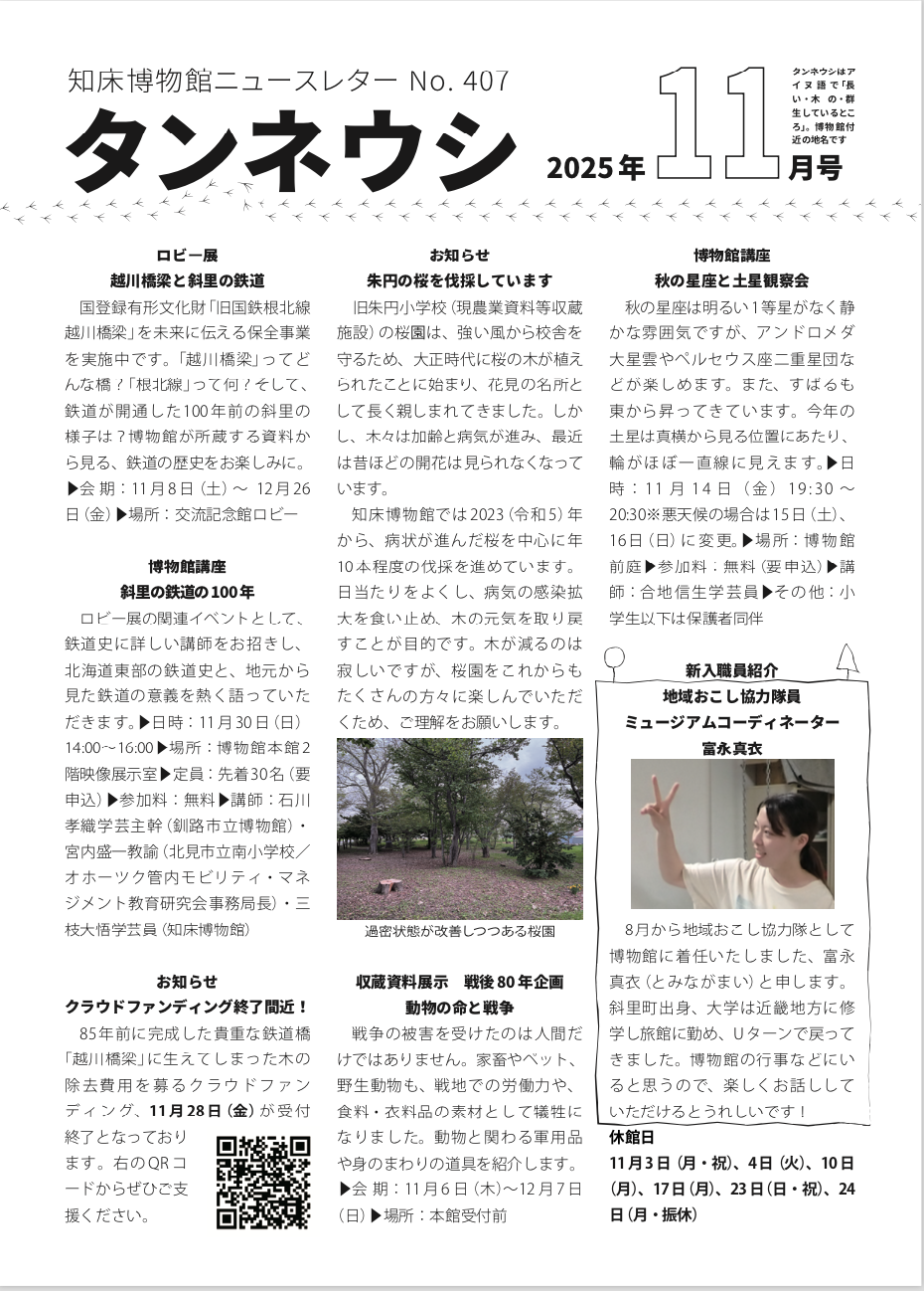 振り返ってみると、『斜里町史』第1巻の戦争についての記述は限られ(全939ページ中、「太平洋戦争と斜里町」は13ページ)、博物館の常設展示にも戦争資料コーナーはありません。その理由は定かではありませんが、斜里が大きな戦災を受けなかったことが挙げられると思います。 道東各地が広く被害を受けた 1945年7月の空襲では、斜里川の鉄道橋 が爆撃されましたが、幸い死者はなかったようです。地元で多くの死傷者が出なかったことが、町の歴史を語るうえでの戦争の存在感に繋がっているのではないでしょうか。
